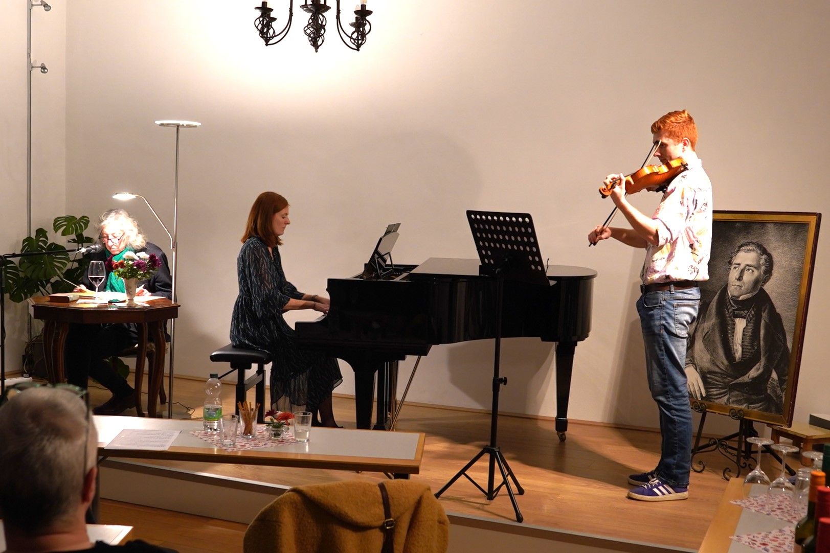 Ruhig, mit heiterem Unterton, trug Frieder Badstübner einzelne „Portionen“ aus dem Buche vor, wie der Autor seine Kapitel genannt hat. Die altmodische, leicht umständlich erscheinende Sprache kam dabei wunderbar zur Geltung. Das Ganze abgerundet aber hat – wie könnte es anders sein – Loewes Musik. Sophie und Clemens Porsche, zwei der drei erwachsenen Kinder des ICLG-Präsidenten Andreas Porsche, ließen mit Klavier und Geige verschiedene Melodien des „Balladenkönigs“ erklingen.